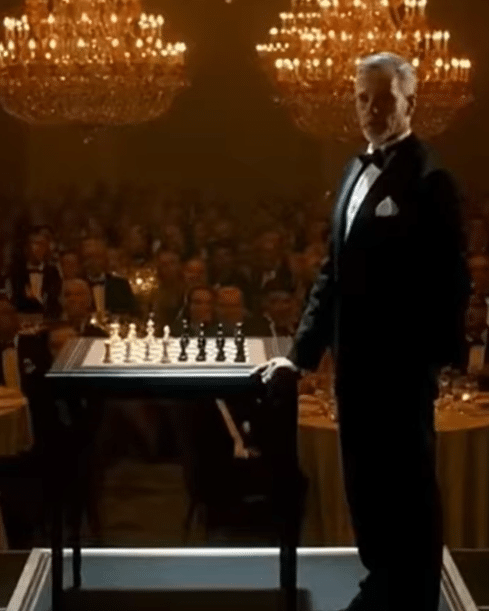 Crystal chandeliers rained light across the marble floor. Gold-trimmed columns reflected the glow of hundreds of candles set in mirrored sconces. Men in black tuxedos and women in silk evening gowns stood in neat clusters, their champagne flutes catching the light like tiny trophies. At the center of it all, on a raised platform draped in velvet, stood a chessboard crafted from ebony and ivory.
