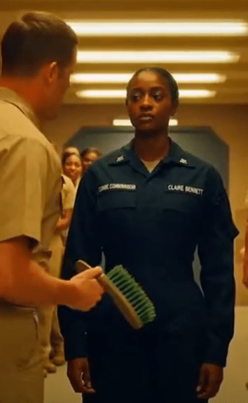As she walked forward, the two officers behind the admiral turned with disciplined timing and fell into place. She was no longer the silent woman in the blue work suit at the center of someone else’s joke.