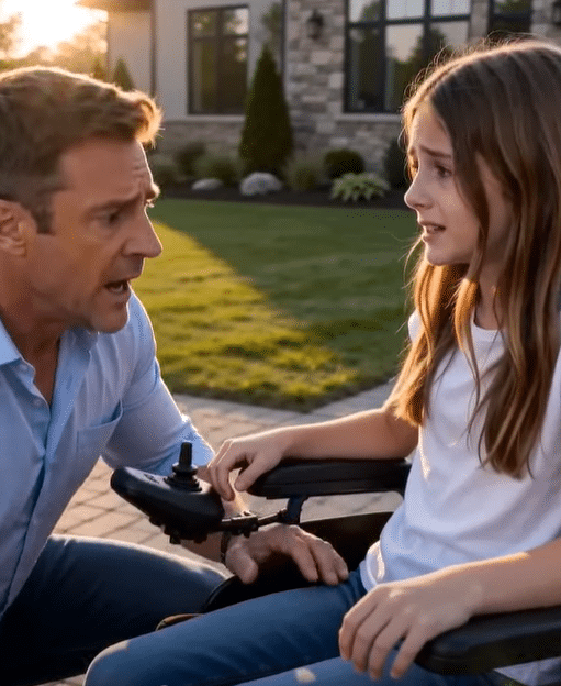 Daniel dropped to one knee so fast that his phone slipped from his hand and landed on the driveway with a crack he barely noticed. Emily sat in her wheelchair, her small fingers clenched around the armrests, her face pale and wet with tears she was trying hard not to let fall. She was only nine, but in that moment her eyes looked older, filled with a fear no child should ever have to carry.
