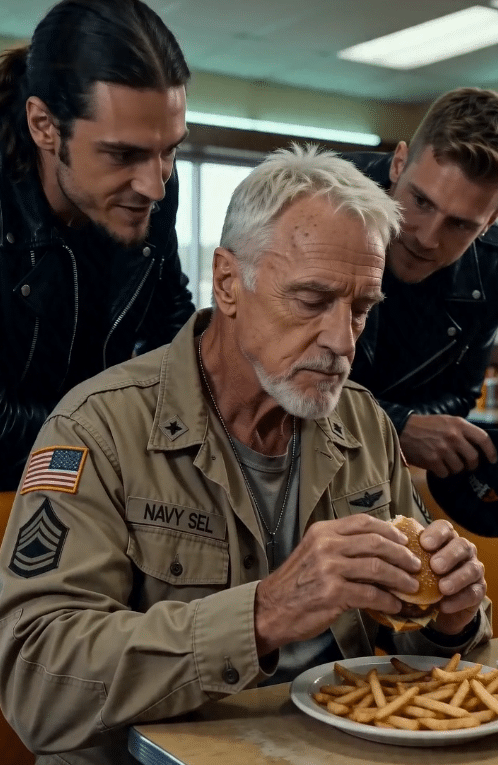 He ate slowly, with the careful patience of someone who had learned a long time ago not to waste a hot meal. Burger cut in half. Fries pushed into a neat corner. Greens he hadn’t touched yet. His tan jacket hung open just enough to show a gray T-shirt beneath it, and across the chest of the jacket, stitched crooked in black thread, was a patch that read NAVY SEL.